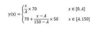 设某科目原始成绩合格分数线为A(0<A<150),若考生在该科目的原始成绩为x(0≤x≤150),则转换分y(x)(0≤y(x)≤120)的计算公式为: